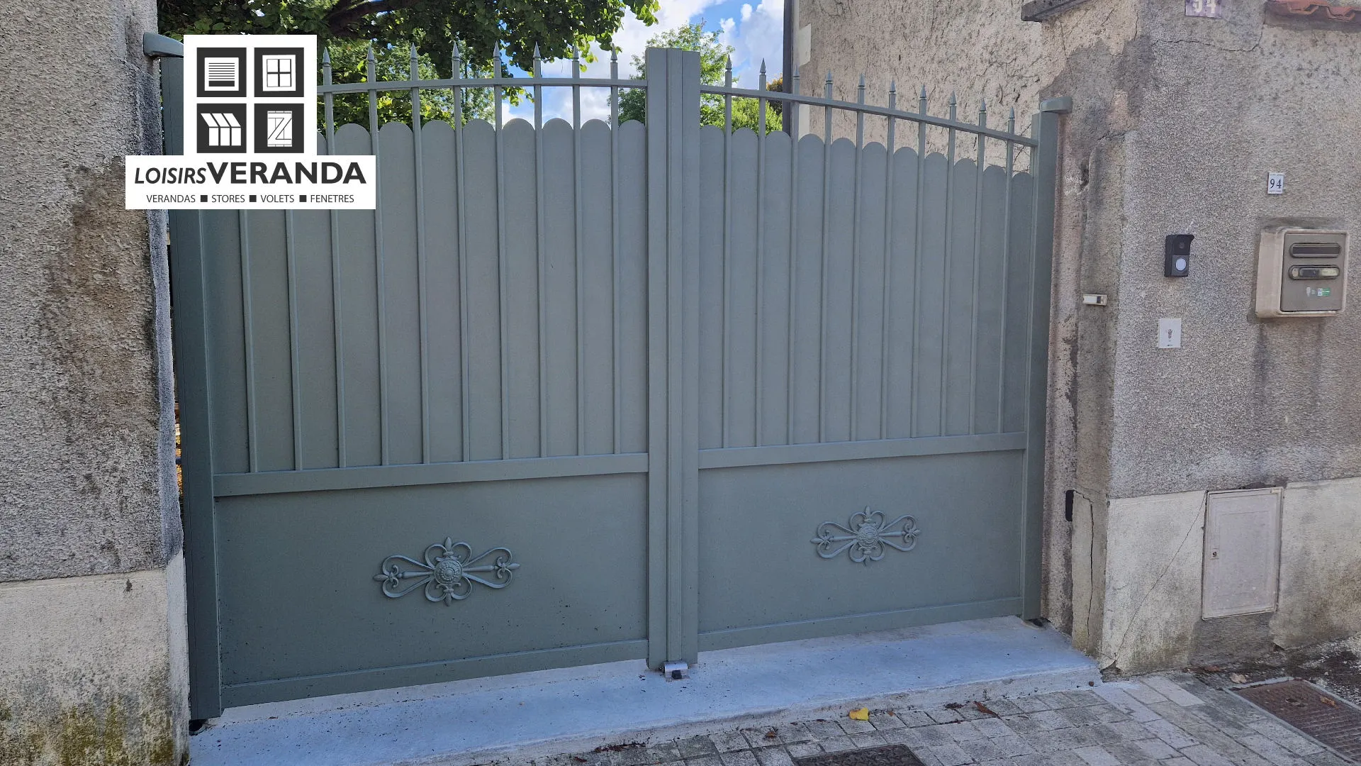 « Portail en aluminium haut de gamme installé par Loisirs Véranda (spécialiste local depuis 1983). Zéro Entretien, design contemporain, sécurité assurée, motorisation. »